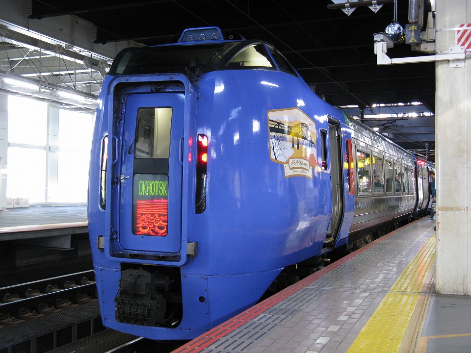 | 「オホーツク1号」網走行き。ヘッドマーク(ヘッドサイン?)も「OKHOTSK」だ。 キハ283系。 |