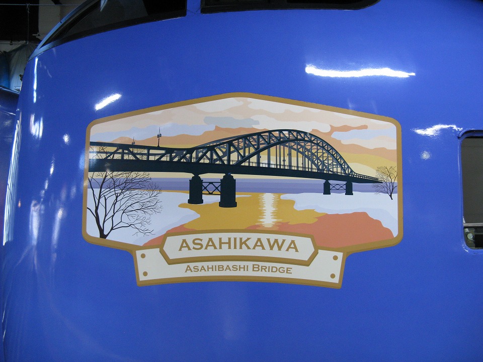 | 先頭部にはラッピングが施されていて、このクルマは旭川市の旭橋だった。 JR北海道の公式ウェブページによれば、全部で8種類あるみたい。 |