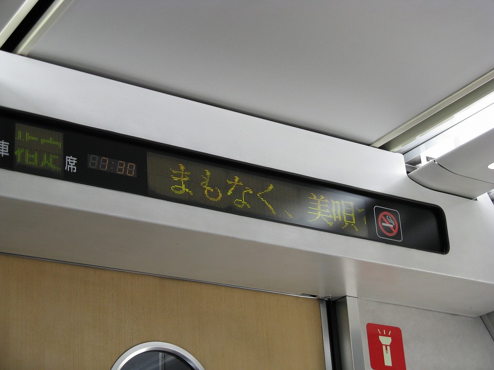 | 「イランカラプテ」(アイヌ語で「こんにちは」)で始まるちょっと長い、自動音声の約5分の動画はこちら。 途中の停車駅と到着時刻の肉声案内を収録したかったのだが、入線直後にすぐ案内されてしまい、 カメラのセッティングでバタバタしていて間に合わず、ほんの最後の部分しか収録できなかった。 その部分も動画に入れてあるよ。 指定席は確保してあるが、スピーカー直下の自由席で収録した。たまたま駅名表示板が画像に入る席だったのはよかった。 収録が終わったら指定席に移動したよ。 |