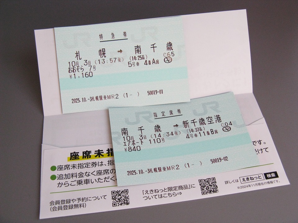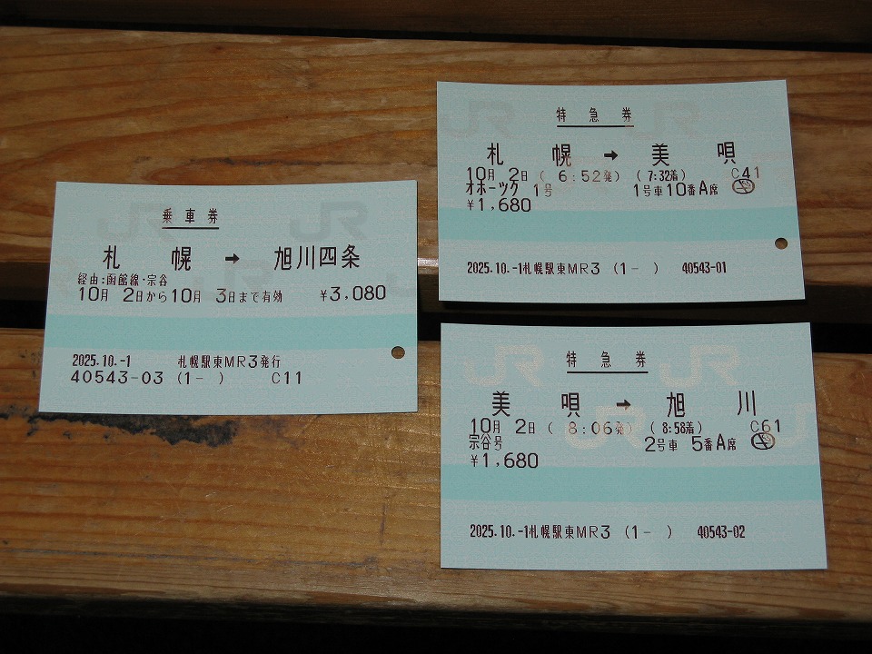 | 昨日10/01に札幌駅に着いたときに買っておいたきっぷ類。 「オホーツク1号」のちょっと後を「宗谷」が追っかけてくる。 途中の停車駅はどちらも同じなのでどこで乗り換えようかと思ったのだが、乗車時間が大体同じになる美唄(びばい)にした。 どちらの列車も、「いつまでもあると思うな」だと俺は思っているので、今回いい機会だから乗りたかったのサ。 |