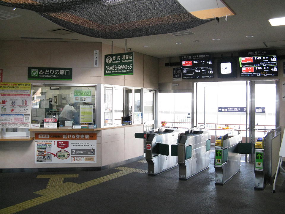 | 美唄駅の出札口と改札口。 みどりの窓口があるのは嬉しいが、話せる指定券発売機も設置(写真左のアングル外。)されており、 基本的に客にはそちらを使わせている。 みどりの窓口の営業時間内だが、「休止中」の札を出している。 |