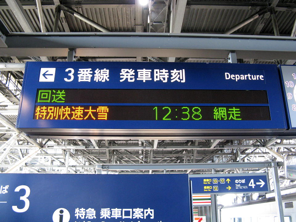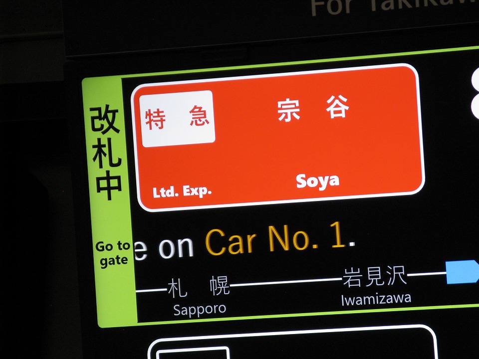 | 「宗谷」の改札が始まった。駅の自動案内と、この発車案内で「改札中」をわざわざアピールするんだ。 でも、自動改札なので、機械を通せるきっぷを持っている客は関係なく、いつでも通れる。 |