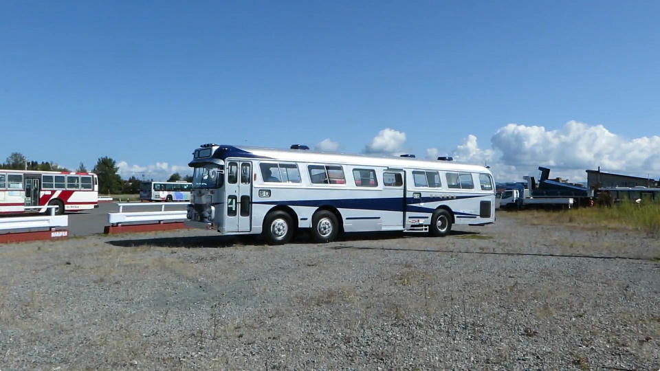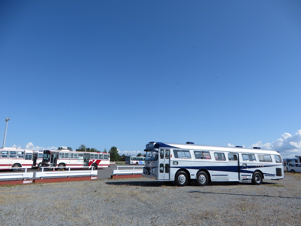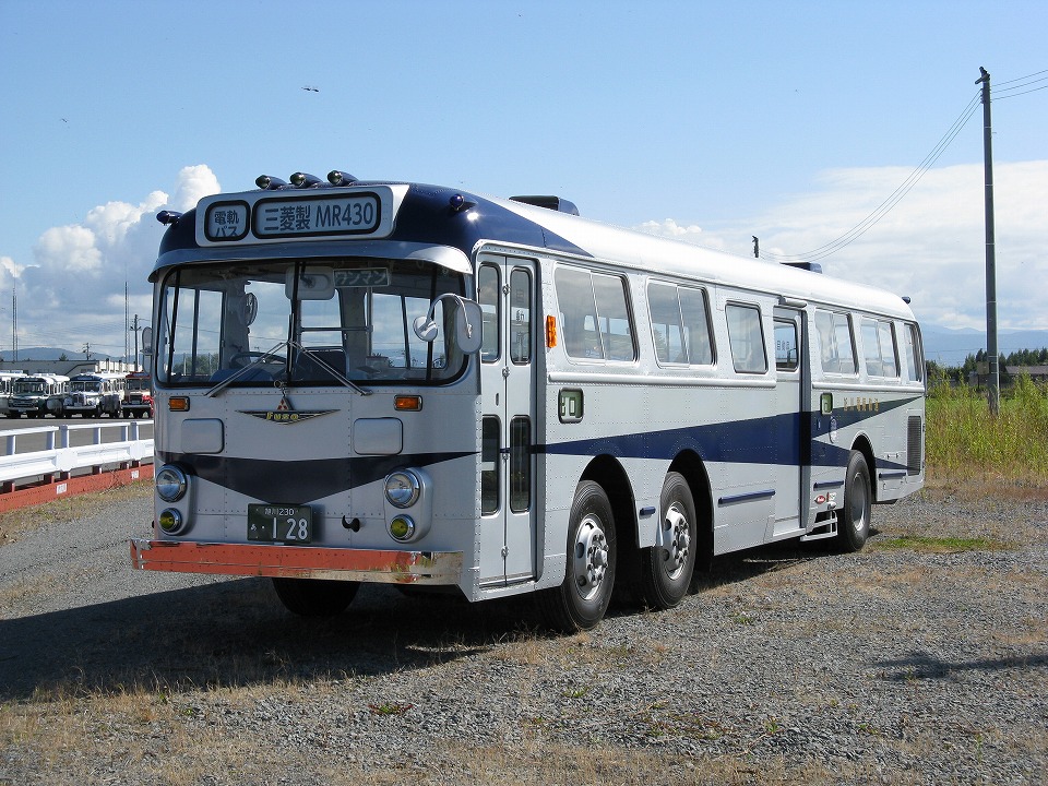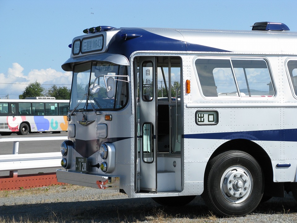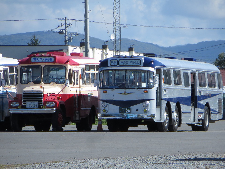 | 写真左の現代のバスと一緒に。 よく晴れて暑い。トンボがたくさん飛んでいる。 |