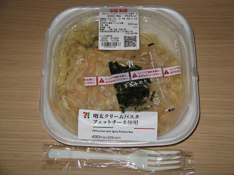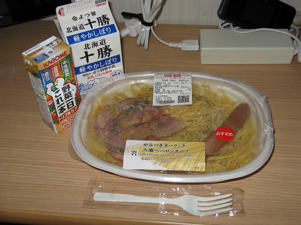 | 朝メシ。また1階のイレブン屋で買ってきちゃった。 1階にコンビニがあるとよくないね(笑)。 朝からニンニクタップシのパスタ。まだこれからシゴトがあるってのに。 |