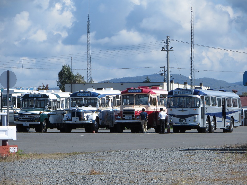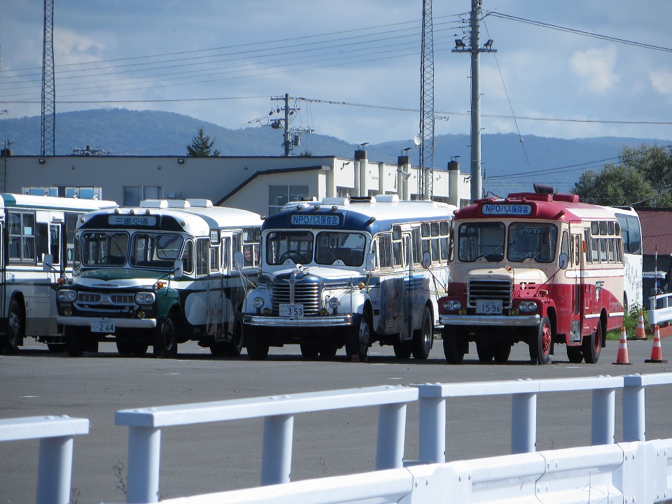 | バスセンターの敷地の奥には今回のイベントのためにやってきた、NPOバス保存会のボンネットバス3台も停まっていた。 これだけでも、相当にハァハァもんだよね。 左から、 ・元三重交通の、1966年型いすゞ「BXD30」(後期型) ・元岩手県交通の、1964年型日野「BH15」 ・元山形交通の、1967年型いすゞ「TSD40」 |