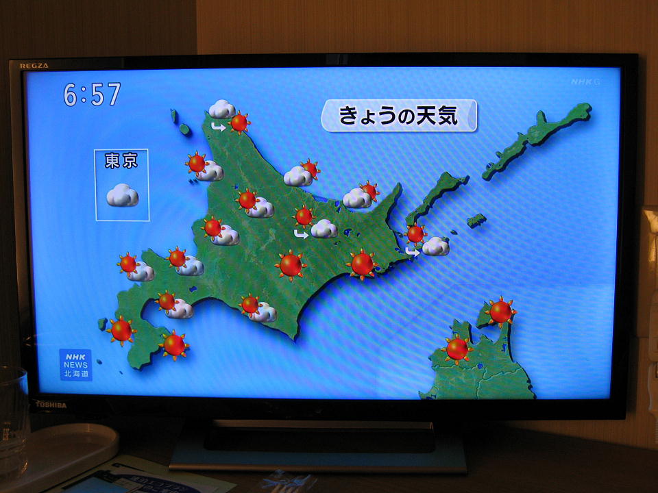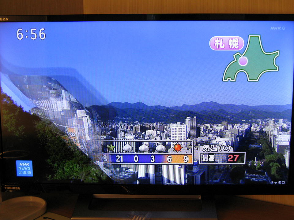 | さて、出張最終日。 札幌は朝からよく晴れた! NHK札幌の天気予報の画面を撮ろうとしたら、ちょうど変わり目になっちゃった。 最高気温の予想は27℃だ・・・。10月の札幌だぞ。大丈夫か? |