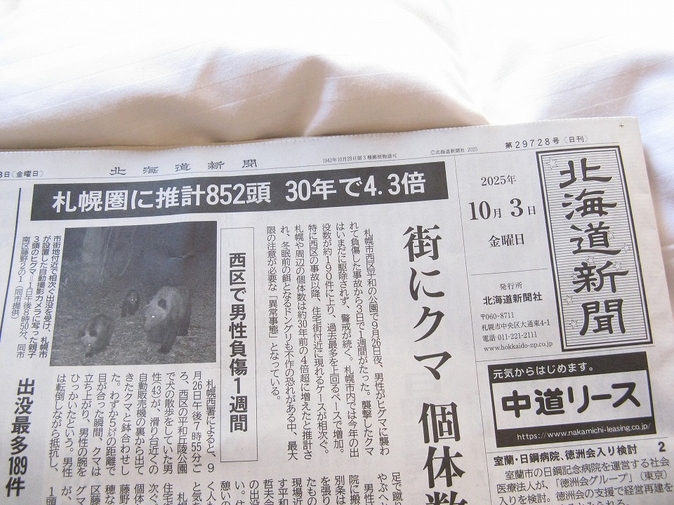 | 2025の夏前ぐらいから、東北・信越・京都・島根辺りでクマの出没件数が増えているが、 北海道でも多いんだね。道新の1面トップの記事にもなっていた。 余談だが、北海道での「クマ」はヒグマのことで、北海道以外でのツキノワグマより随分デカい。 しかも凶暴らしい。おっかねぇ~。 |