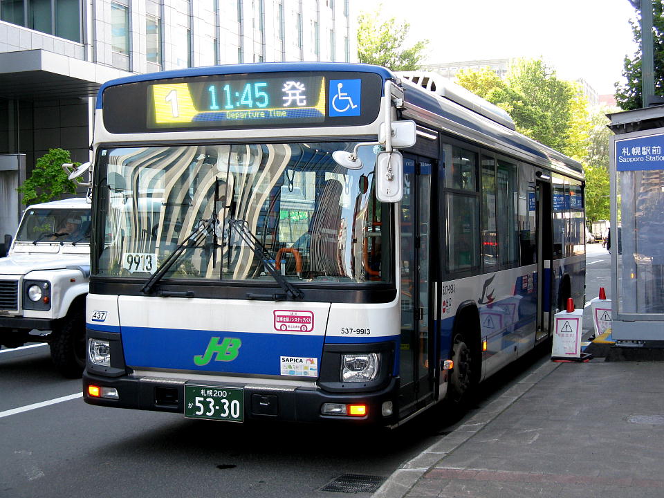 | そこで、ジェイアール北海道バスの新札幌線(札幌駅前~新札幌駅:系統番号1)ってのに乗ってみる。 平日は札幌駅前発06:30から22:30まで、大体10~15分毎にどんどん出ている。 バス停に来たらちょうど発車待ちのクルマがいた。 行先表示部分に発車時刻と行先を交互に表示していて親切だ。 |