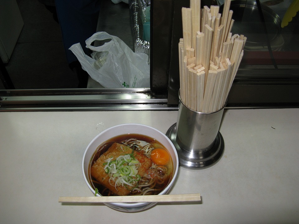 | 札幌に着いて昼メシ。 きつねそば490円ナリ+生玉子90円ナリ。 箸入れの強引さがナツカシくて、写真に入れました。最近こんな詰め方はあんまし見ないよね(笑)。 メシを喰ったら、空港に向かうゾ。 |