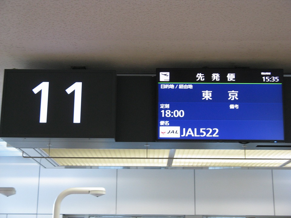 | 羽田行きJAL522便は11番ゲートからの搭乗だ。 この写真はビミョーにブレている。 |