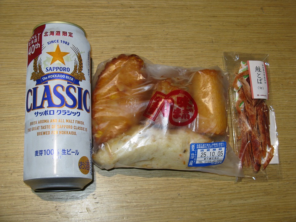 | 搭乗待ちの間、軽く呑む。 サッポロクラシックと、つまみで「かま栄」の蒲鉾各種と羅臼の鮭とば。 どれも旨いのだ(つい「まーさんよー」と書きたくなるが、沖縄方面の旅ではないので書かない。)。 |