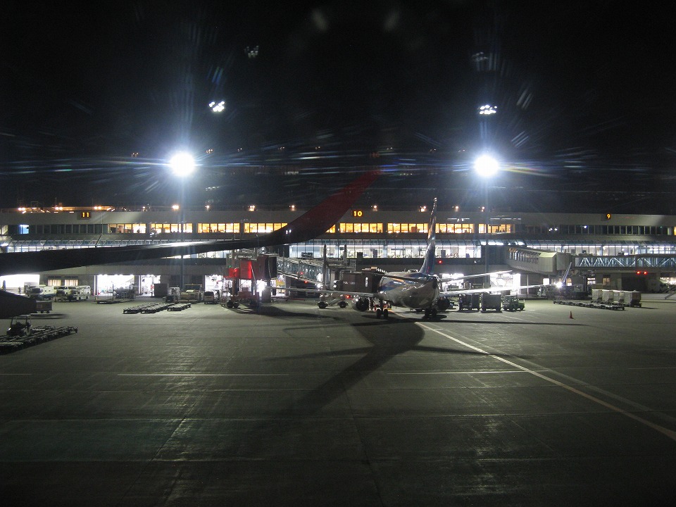 | 搭乗ゲートからバックして、一旦停止。 夜間の離陸のため、万が一に備えて乗客の目を慣らすために機内の照明を暗くしているので、 周りからの光が入らず、このように割ときれいな写真が撮れる。 |