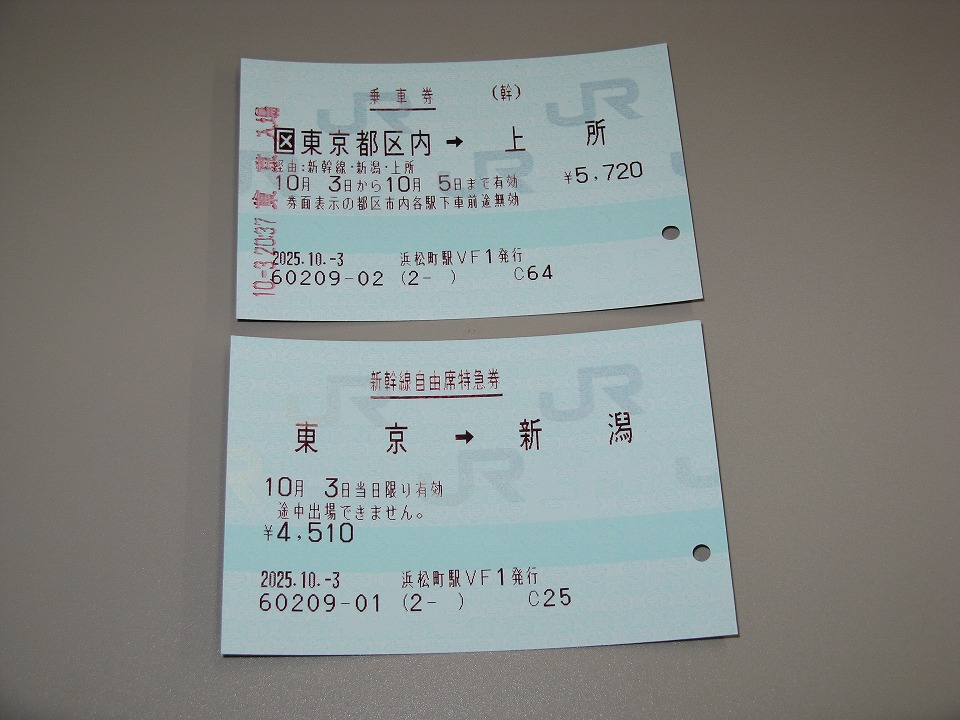 | 羽田に着いたらモノレールで浜松町に出て、指定券発売機で新潟までのきっぷを買い、山手線で東京に出た。 この写真は「とき345号」に乗ってから撮影。 |