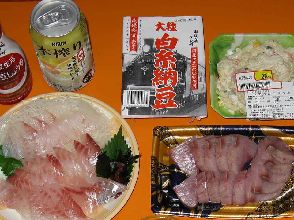 | 晩メシ。 刺身は、左上が新潟産ヒラメ、左下が山形産チダイ、右が鳥取産ブリ(柵を厚く切った。) あ、テツ系としては、なっとの掛け紙がSLだ(「ばんえつ物語」の編成だが、ヘッドマークがない。)。 |