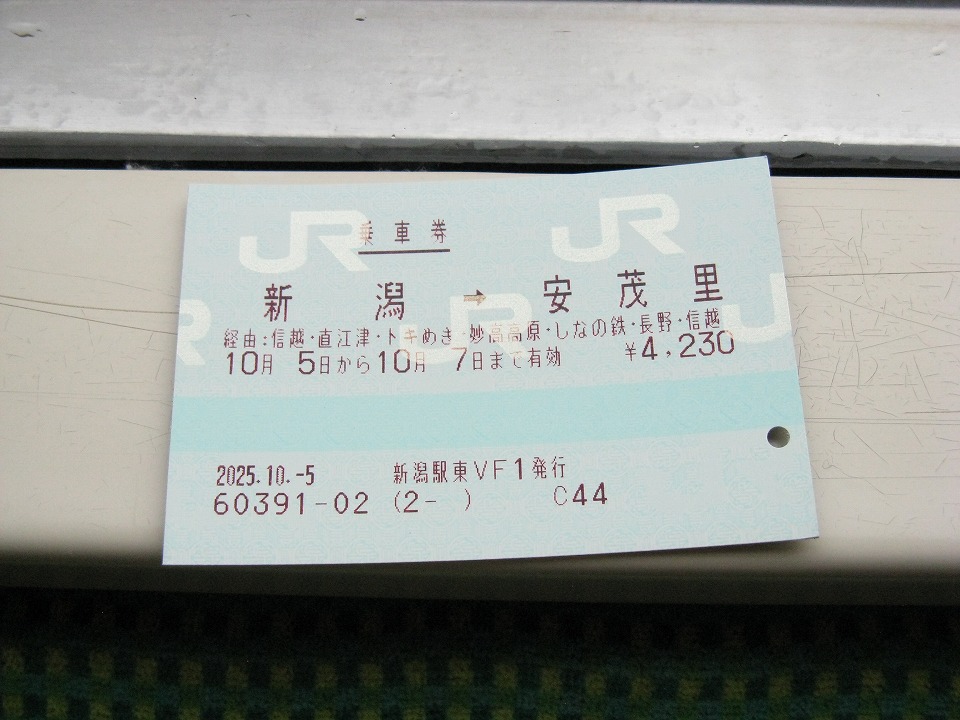 | あ”~! 直江津駅を出るときにうっかり「しらゆき6号」の指定席特急券も自動改札に入れちまった! せっかく取っておこうと思ってたのに~。鈍行で直江津に来たと思えば、ま、いっか。でも悔しいな。 せめて乗車券の写真を念のために撮っておく。 |