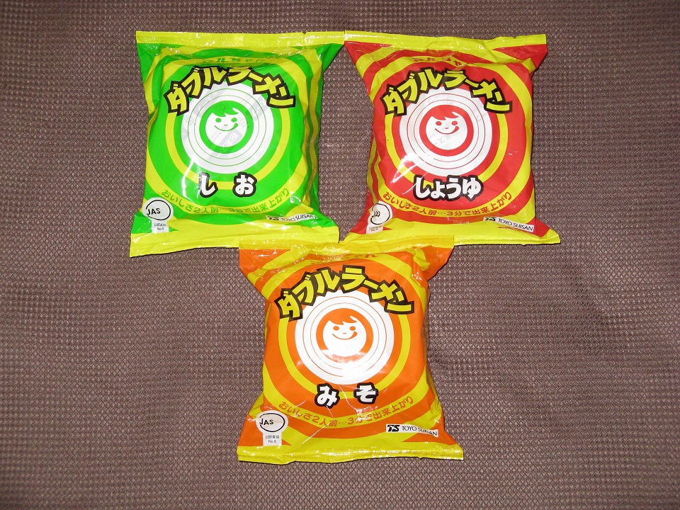 | 北海道といえば、マルちゃんダブルラーメン170円ナリ。 旭川駅隣接の「イオン旭川駅前店」で、全てのテイストをGETしたぜぃ。 この写真は帰信(信州に帰ること)後に撮影。 |