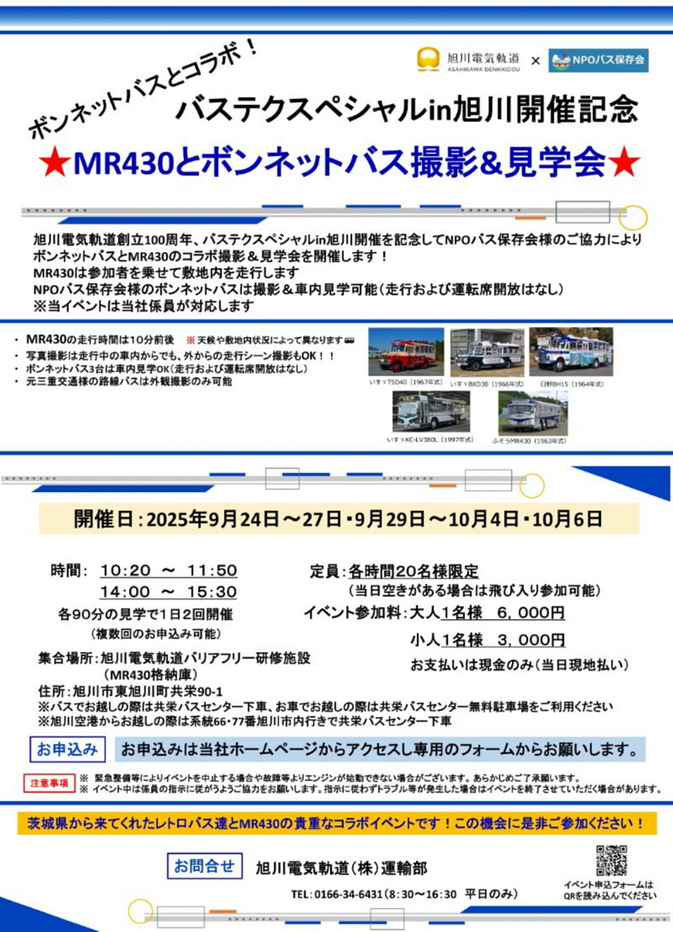| これが今回のイベントのパンフ。 旭川電気軌道の公式ページから拝借した。 ちょうど俺が札幌に出張する日も開催日であり、しかも午前の部に参加してから札幌に移動してもシゴトに間に合う! 背景として、 今回の出張が決まってから、シゴト以外では何をしようかをいろいろと考えていた中で、 俺が、『将来、廃止の恐れがあると勝手に心配している特急に今のうちに乗っておこう。』 ということをメインにしつつ、 せっかくのチャンスなので、『JR北海道の特急になるべくたくさん乗ること』 にした。 んで、まず本数の少ない「オホーツク」と「宗谷」は朝に乗り継ぎできるから、すんなりエントリーした。 その他、「おおぞら」「北斗」・・・、それに電車特急も乗りたいから「ライラック」「すずらん」も・・・なんてことを考えているうち、 「オホーツク」と「宗谷」で旭川に着いたら何を喰おうかなんてことを思ったところに、 「そういえば旭川といえば、あの3軸バスは今どうなってんのかな」とフト思い、何気なく検索してみたら、げげげ、 こんなイベントがあるのぉ? となったわけだ。 それなら、「オホーツク」と「宗谷」で旭川に着いたら、絶対こっちだよね! となったワケ。 参加費がチト高かったし、イベント終了の11:50まで拘束されるのなら、旭川12:00発の「ライラック20号」に間に合わないので、 イベントは傍観することにした。「参加」じゃなくても、バスの写真ぐらいは撮れるだろ。 |