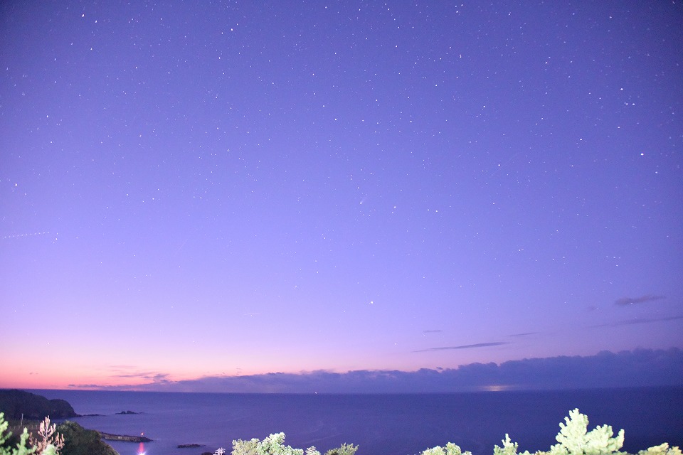 | さて、最初の撮影に出かけた。 早番のシゴトを時間ぴったしで終わらせて職場を飛び出し、ダッシュで新潟県の海っぱたにきた。 ここなら西北西~西方向が開けている。 第1印象は、あれ? この方角に「レモン彗星」がいるはずなのに、見えないよ、だった。 撮影ポイントには、群馬からやってきたという先客が1人いたので、この方のアドバイスで、ひとまず広角で西方向をてきとーに撮影してみた。 15秒の露光なのでこれだけ明るく写っているが、実際はほとんど真っ暗け。 撮影後にデジイチのディスプレイで拡大して上下左右を丹念に探してみたら、あ~いたいた。「レモン彗星」がほぼ真ん中に写っていた。 うわ~、ちっっせぇ~(笑)。 このあと、徐々にズームで望遠にしつつ、最大の300mmにした。 今日は、月齢1.6で、17:25月没。 28mm f3.5 15秒 ISO6400 ちなみに、中央左端の点々は飛行機ね。 |