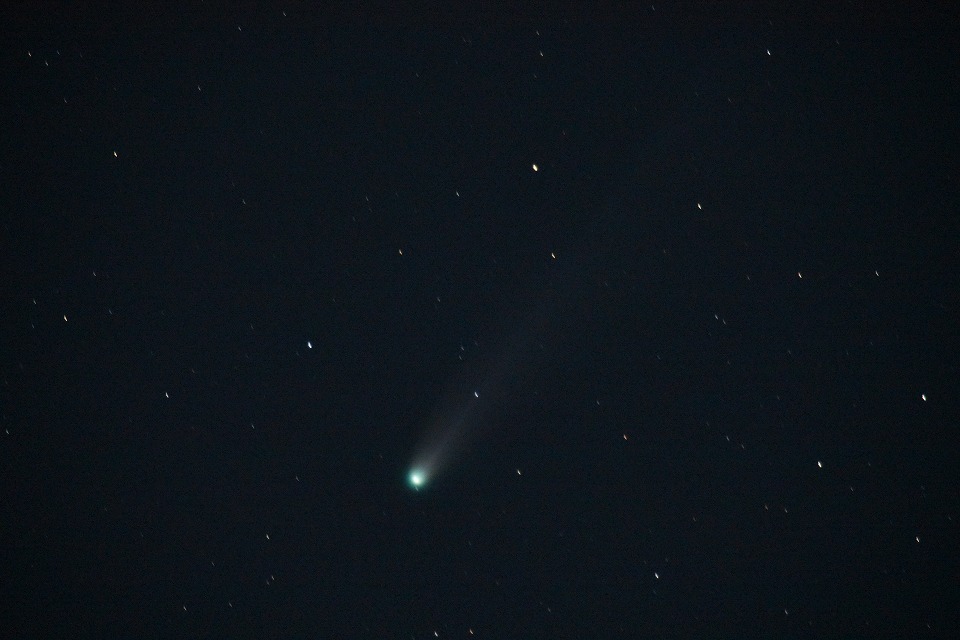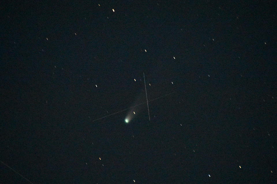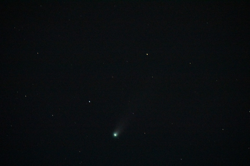 | いったん「レモン彗星」を捉えたら、あとはシャッタースピードやISO感度を変えながら、"いい具合"の写真になるようにを念じつつ、ひたすらに撮影し続ける。 この日は幸い見事に晴れたので、約50分で90枚撮影した。 この写真は、あとでPCで見て分かったが、人工衛星の光跡がクロスしていた。 「レモン彗星」もそうだけど、人工衛星の光も、よほど明るいもの以外は肉眼ではほぼ見えない・・・。 この写真は、トリミングと、画質調整をしている。 300mm f5.6 6秒 ISO12800 |