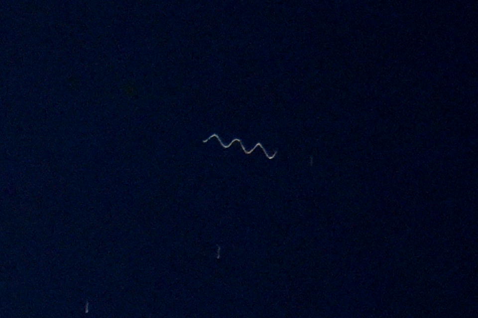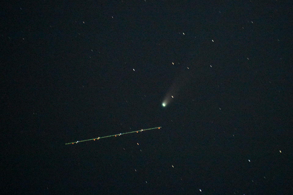 | 昨日予習しているので不安や緊張はなく、「レモン彗星」はすぐに見つけることができた。 この写真は、試し撮りをしている中でフシギな光跡が写ったので、その部分だけをトリミングしたもの。 空にミミズがいるのか! っというのではなくて、露光中に人工衛星が通過したんだけど、ちょうどカメラが上下に揺れたのさ(笑)。 |