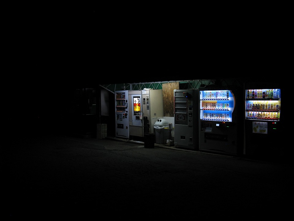 | 【おまけ】 新潟の撮影ポイントから信州へ帰りしな、「う・そ自販機」に寄る。 昼メシ以来何も喰っていないので、ハラが減りまくっている。 この写真は「ポツン感」を出すために、あえて遠目から暗く撮影した。 あれ? 「う・そ自販機」は、手前に傾いているか? 6mm(35mm相当) f2.8 1/15秒 ISO100 あ、コンデジのデータなんかいらないか(笑)。 |
