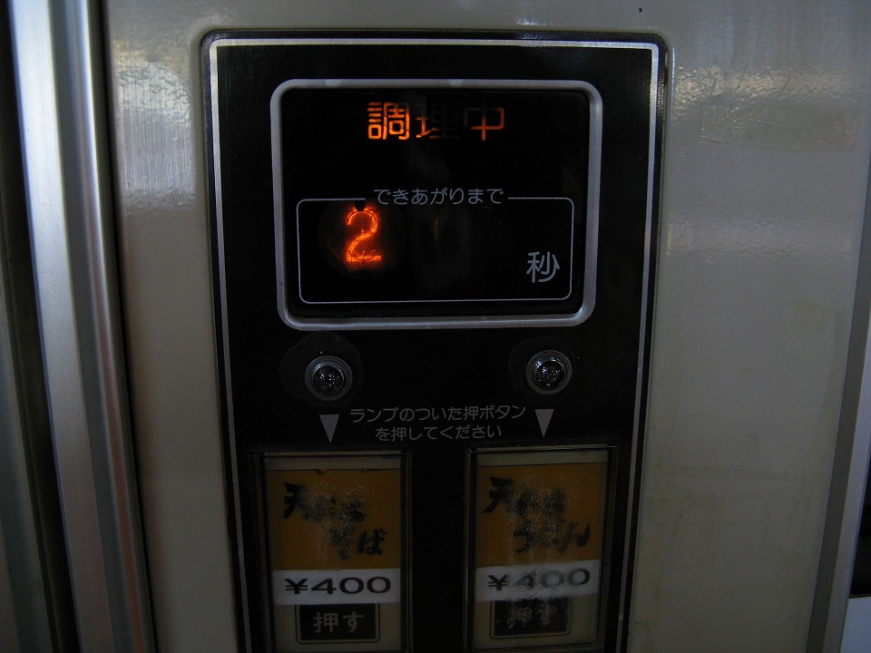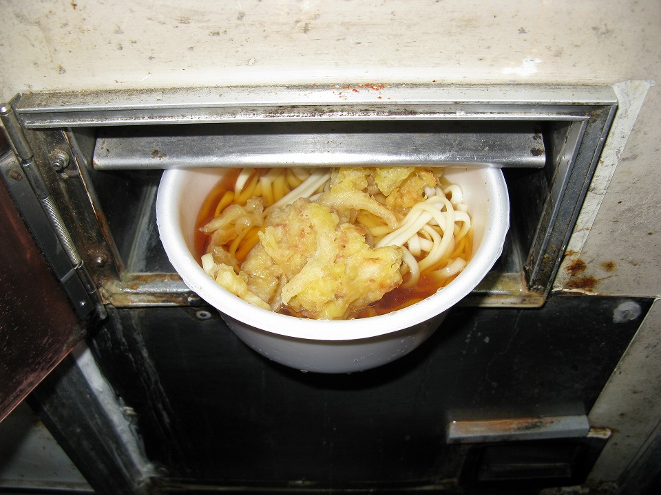 | 25秒でできあがる天ぷらうどん400円ナリ。 できあがり時の「チーン」音(=単純に「できあがり」を知らせる音で、電子レンジ的に温めているのではないよ。)は健在。 また、丼は昔ながらのプラスチック製だ。最近は同型の発泡スチロール製も多いから、これは貴重だ。 |