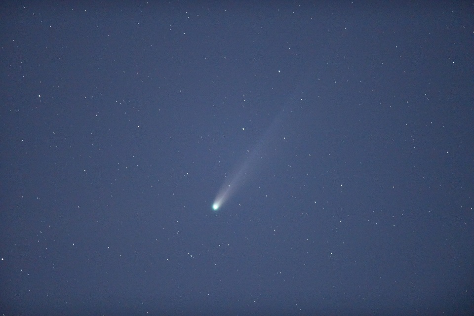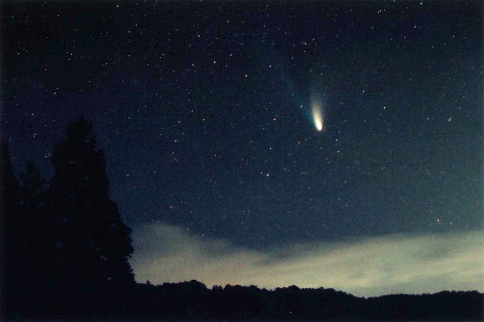 | まずはこれ。 長野オリンピック(1998(平成10)年2月)の前年に見ることができた大彗星の「ヘールボップ彗星」。 肉眼でも1年以上もの長い間、ハッキリと見ることができた。 当時の撮影を思い出してネガを引っ張りだし(当時はデジカメなんてなかったのよ。)、 プリントしたものをスキャンしてから経年の退色を調整したもの。 「レモン彗星」は、俺にとってはこのとき以来の彗星撮影だ。 この写真は、長野市でフィルムカメラで撮影。 写真のデータは、フィルムがフジカラーHR1600だということ以外にはなんもなし。。。 |