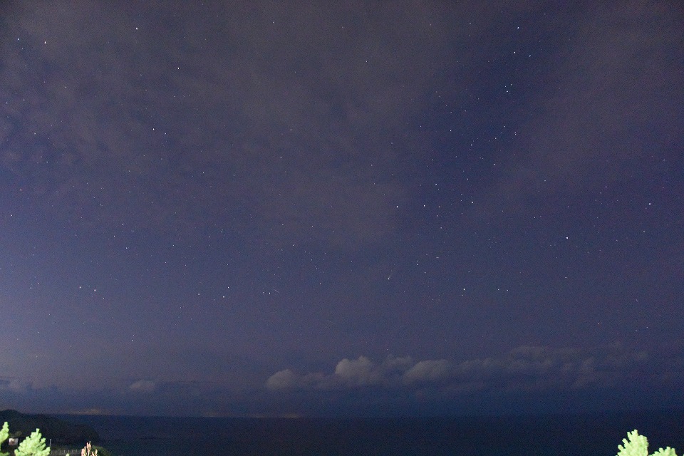 | このように薄雲が広がった。 この写真には「レモン彗星」が写っている(中心から時計の4時半方向)が、レモン彗星が隠れてしまうタイミングもあった。 撮影して分かったが、肉眼では空に星はほとんど見えなくなってしまったが、10秒も露光すると、かなりの星が写るんだね。 28mm f5.6 10秒 ISO12800 |