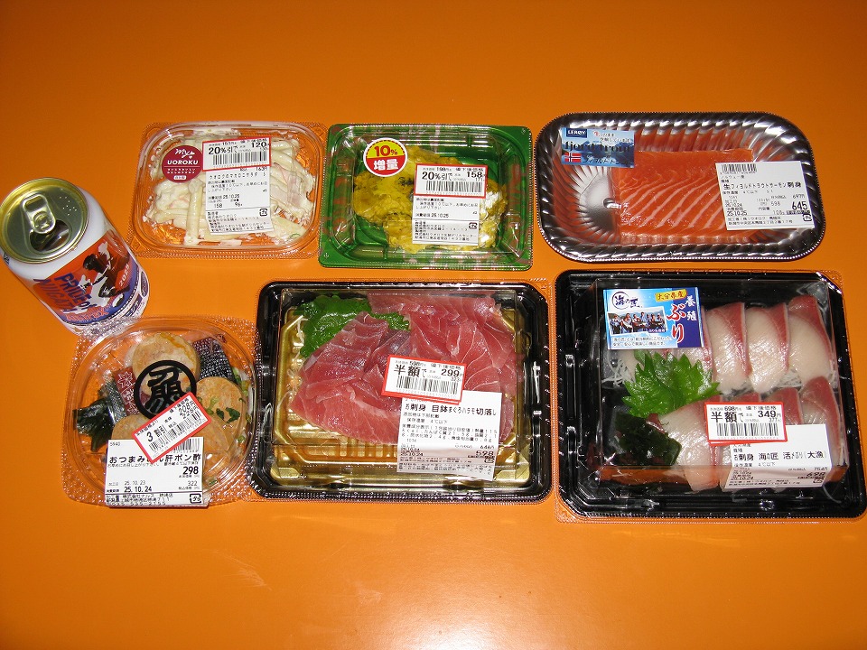 | 10/24の「レモン彗星」の撮影が終わり、北陸道をちょいと走り、途中から下道に降りて新潟のアジトに着いた。 アジト近くのスーパーに行ったら、いろいろと安くなっていたので喜んでGETしてきた。 「レモン彗星」の画像整理をしながら、さぁ呑むゾ! |