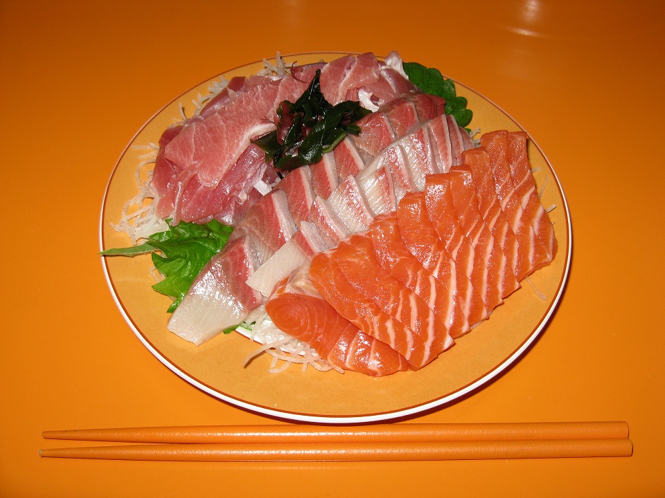 | 刺身類はパックからいったん全部取り出して、 大根のツマを水洗いして短く切り(長いと喰いづらいのよ。)、改めて盛り付けし直した。 では、いっただっきま~す。 このあと、うだうだ呑んで、25時頃チンボツしました。 |