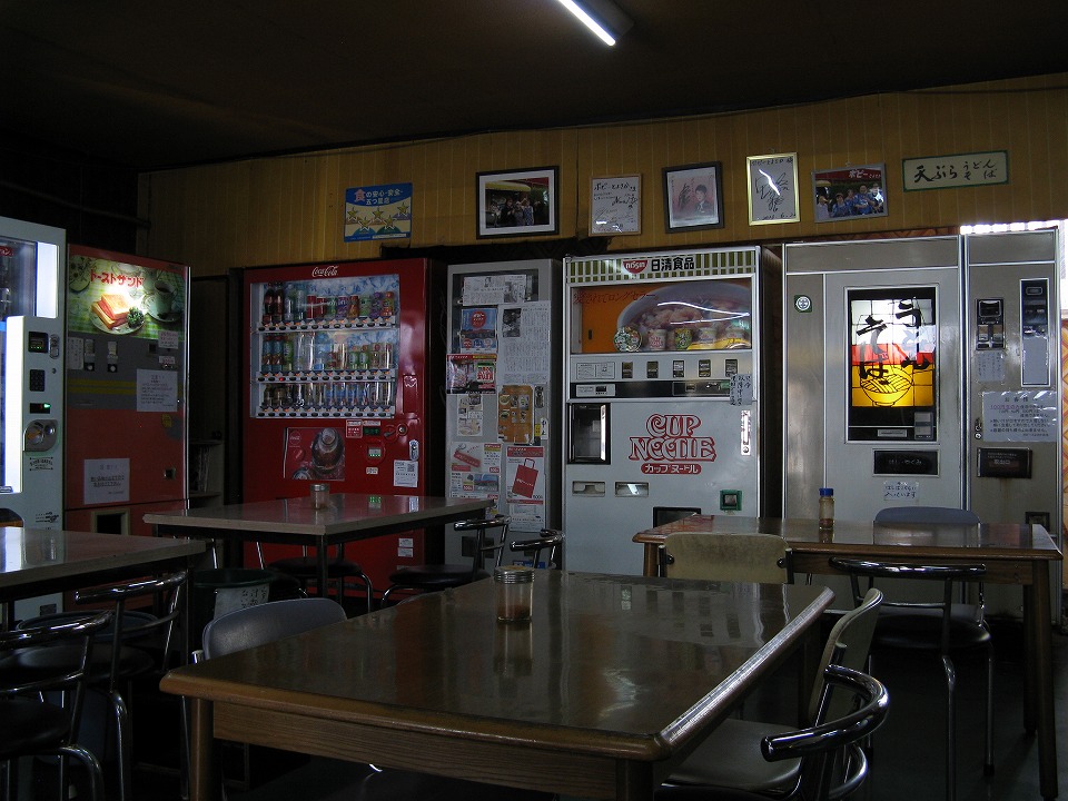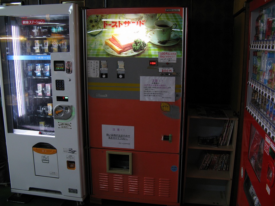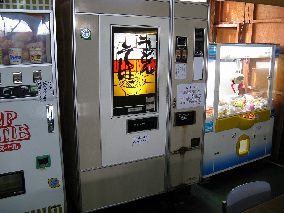 | "それ"とは、レトロ自販機なのですよん。 ここ「ポピーとよさか」には、「トーストサンド」(写真左端)と、「うどん・そば」(略して「う・そ自販機」:写真右端)の2つがある。 この写真は、内照部分(「トーストサンド」や「うどんそば」の部分のこと。)がハッキリ写るように暗めに撮影。 さ、喰うゾ~。 |
