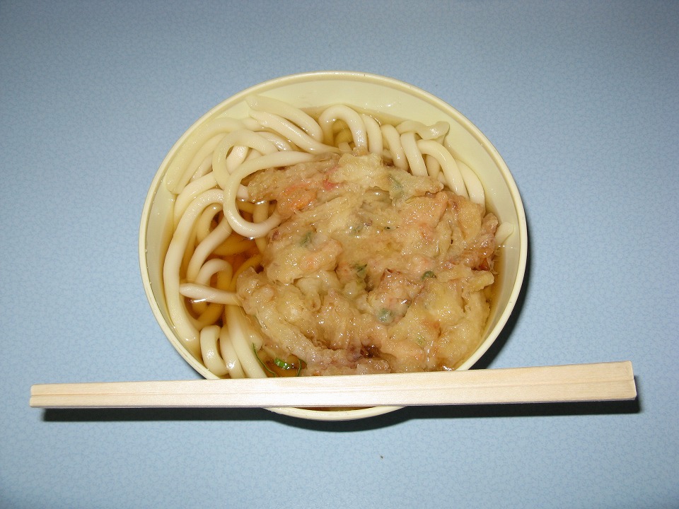 | 天ぷらうどん250円ナリ。 先日と同じで、つゆはかなり少なくて、ぬるかった。 機械の調子がよくないのかな~。心配だ。 |