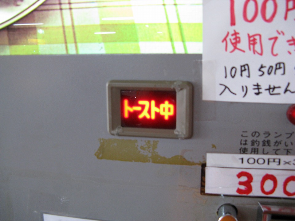 | おカネを入れてボタンを押すと、「トースト中」のランプが点滅する。 この写真はピンボケですね。 |