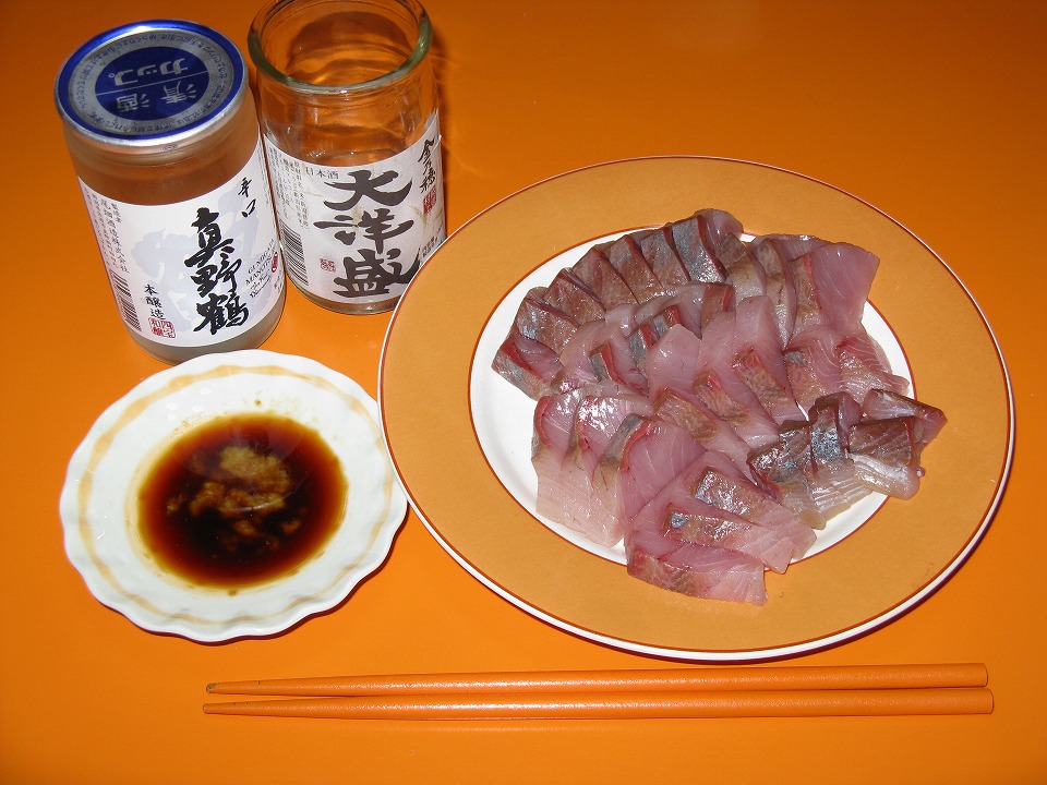 | 晩メシなのだ。 珍しく地酒を呑み、ブリ柵を分厚く切って肴にした。 |
