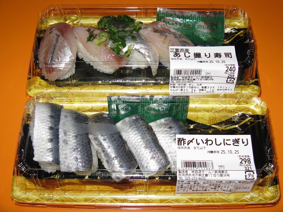 | 〆の鮨。 ど~でもい~けど、 買った後の袋詰めがズレてしまい、鮨がパックの中でゴチャゴチャになった。 しょっちゅうこうなるんだよね。 いつも思うけど、こういうパックをしっかり水平に保てる設計の袋(マイバッグ)ってないのかな。 ネットで探しても"これは!"というものがない。 毎回、スーパーでくれるダンボールに入れるってのも「なんだかな~」だしさ。 |