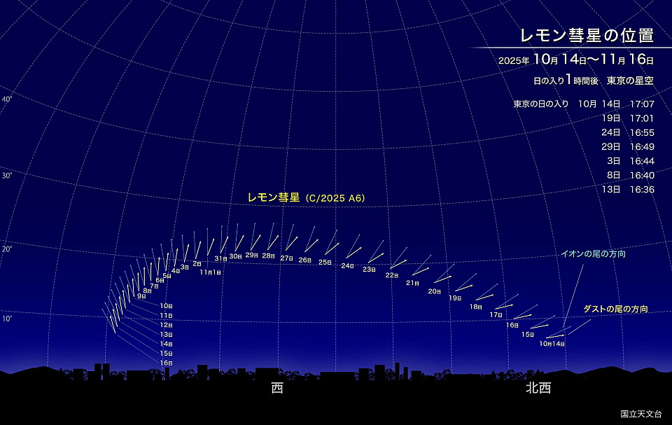 いろいろと考えていた中で、 ひとまず10/23と10/24は晴れて月の影響もほぼないという好条件なので、撮影にチャレンジすることにした。 この画像は国立天文台の公式ページから拝借したもの。 【後日追記】 結果的には、その他の日にも撮影に出たし、月が出ていても何とか写真には写ってくれたよ。 |