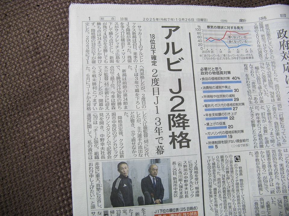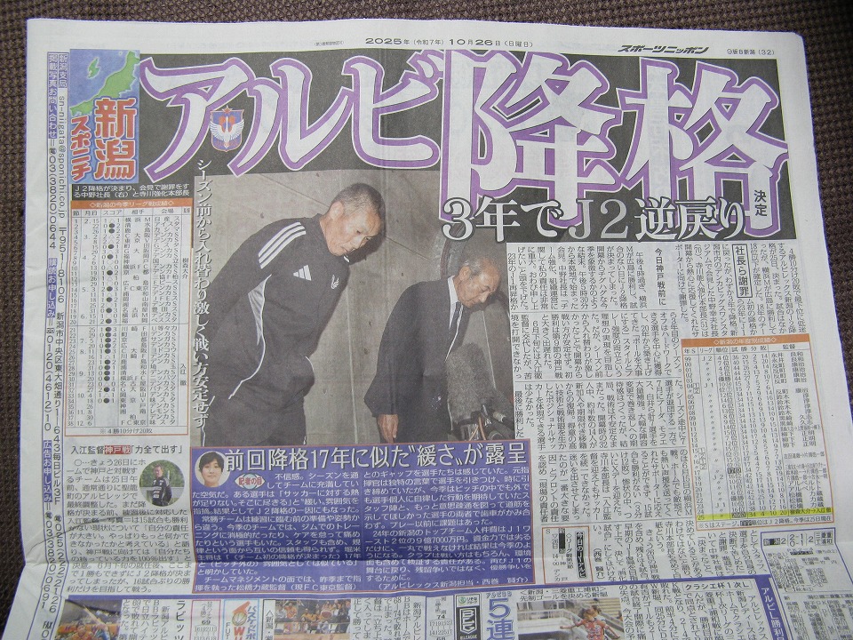 | 新潟のJ2降格が決まった翌日(=神戸戦当日)の地元紙の新潟日報には、記事が1面に掲載された。 |