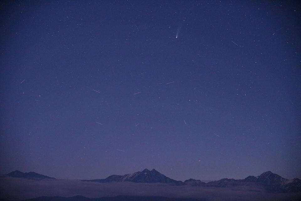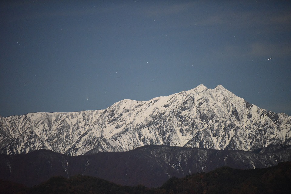 | 月齢13.6のお月様が照らす北アルプスの鹿島槍ヶ岳(2889m)の左側に沈もうとする「レモン彗星」。 ISO6400なら、ほぼ満月だとたった1秒の露光でもこれだけハッキリ写る。 「レモン彗星」は、10月末からは随分左(南方向)に移動している。 200mm f2.8 1秒 ISO6400 ここまでで、ひとまずおしまいね。 この先は「レモン彗星」の写真はありません。 |
