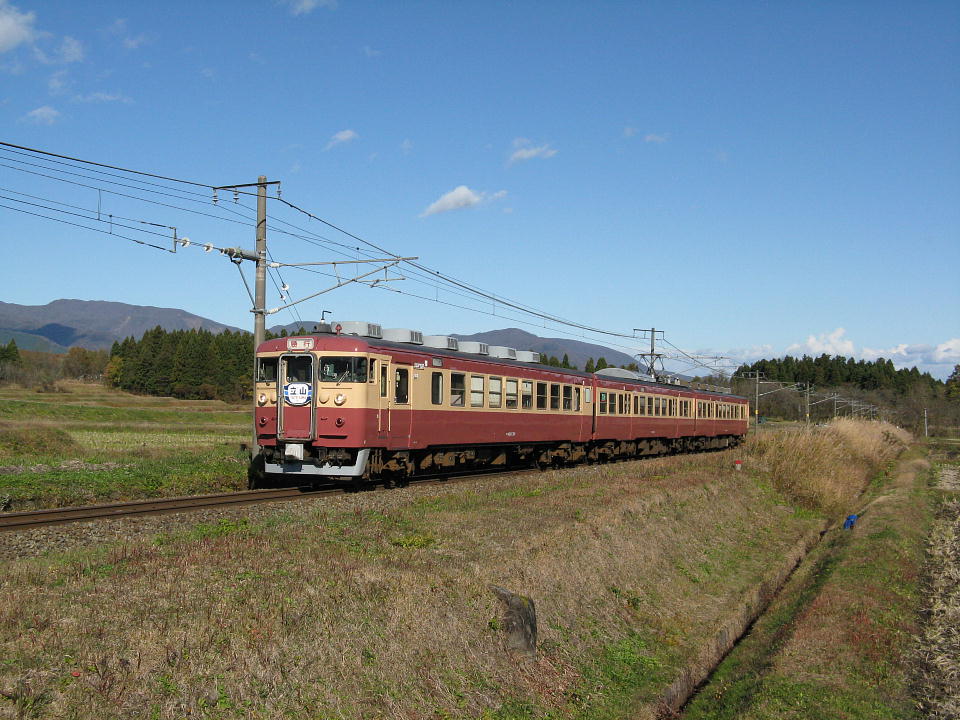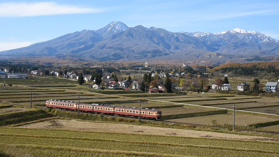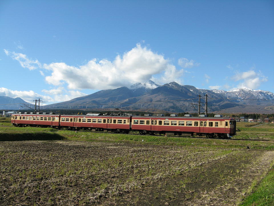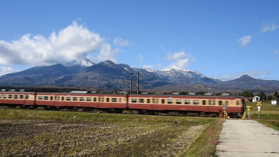 | 妙高高原で折り返し、程なく下りの快速が通る。 バックの妙高山(みょうこうさん:2454m)に ほんの少しだけ雲がかかってしまったのが残念。 |