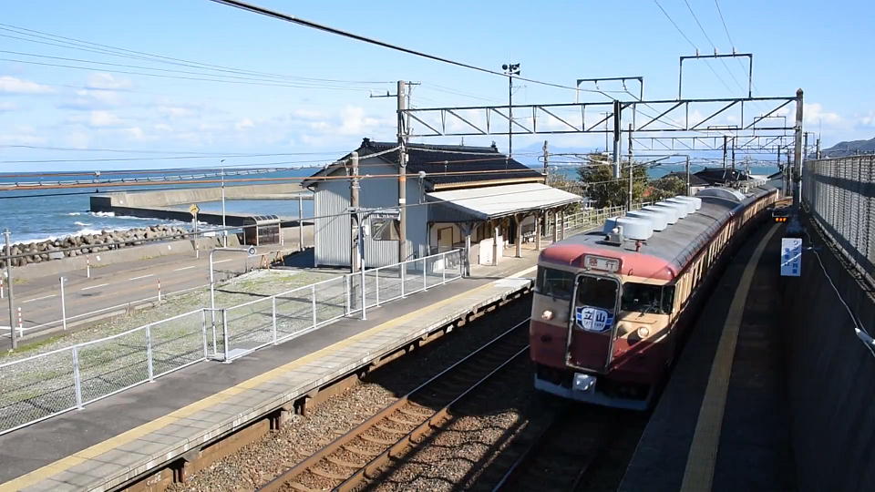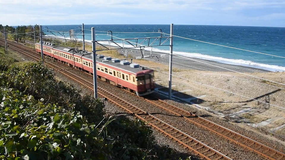 | 次に、日本海を入れて撮影したかったので有間川駅に来てみた。 ここで、「急行1号」を撮影する。 上り列車だし列車番号も偶数だが、号数は奇数だ。 単純に走る順番に番号を付けていると理解しておけばいい。 かっ飛ぶ「急行4号」以外は"急いで行かない"というコンセプトのため、 海が見える区間ではかなり徐行する。 動画撮影には時間がかかるが、写真撮影には向いている(笑)。 約26秒の動画はこちら。 |