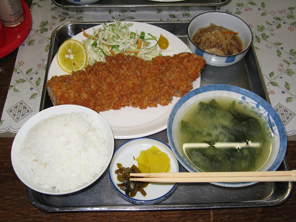 | 熟慮に熟慮を重ねてとんかつ定食980円ナリに決定! とんかつがやたらにデカいな~。 味噌汁は丼で出てきたが「味にはそれほど力をを入れていませんからねっ」 という方針のようだった。 ハラ一杯になるぅ。 ここでは先輩にゴチになってしまいました。 どうもありがとうございます。 |