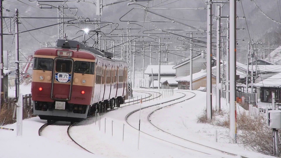 | 直江津へ向かう「急行2号」。 時折軽くスパークしながらノソノソと走っていった。 約86秒の動画はこちら。 |