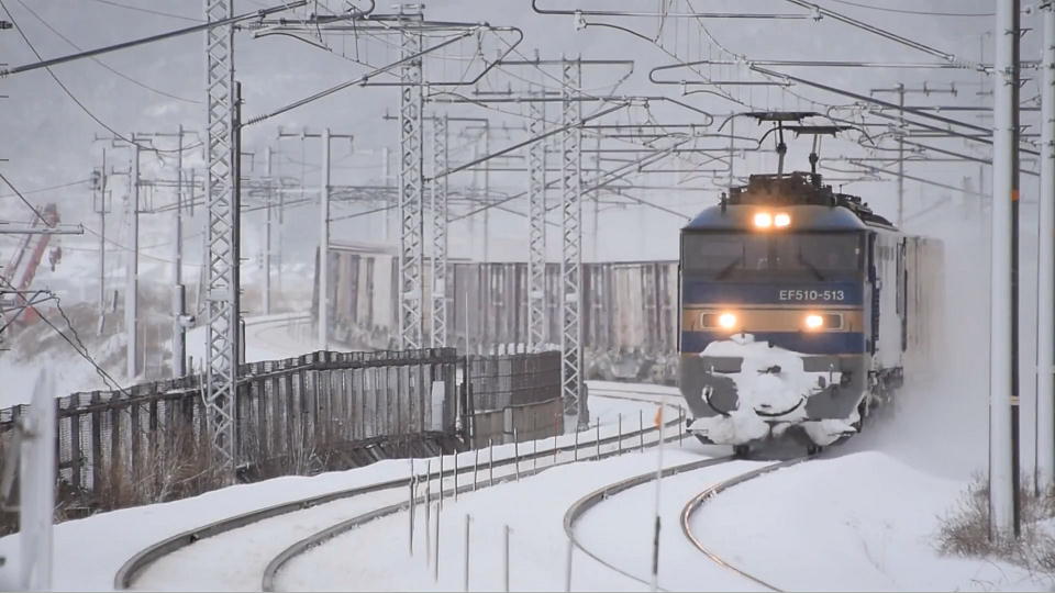 | 【おまけ】 北斗星カラーのEF510-513が牽く貨物列車がやってきた。 左側の下り線を通る「急行2号」を撮影しようとアングルを決めて三脚で構えていたので、 「北斗星カラー」と分かってもとっさにカメラを右に振ることはできず(雲台がボールジョイントタイプなのよ。)、 随分右に偏った動画になってしまった(苦笑)。 このカラーはいいね~。北斗星にはロイヤルにも開放ハネにも乗ったな~。 食堂車も懐かしい。 うねうねと走る約43秒の動画はこちら。 |
