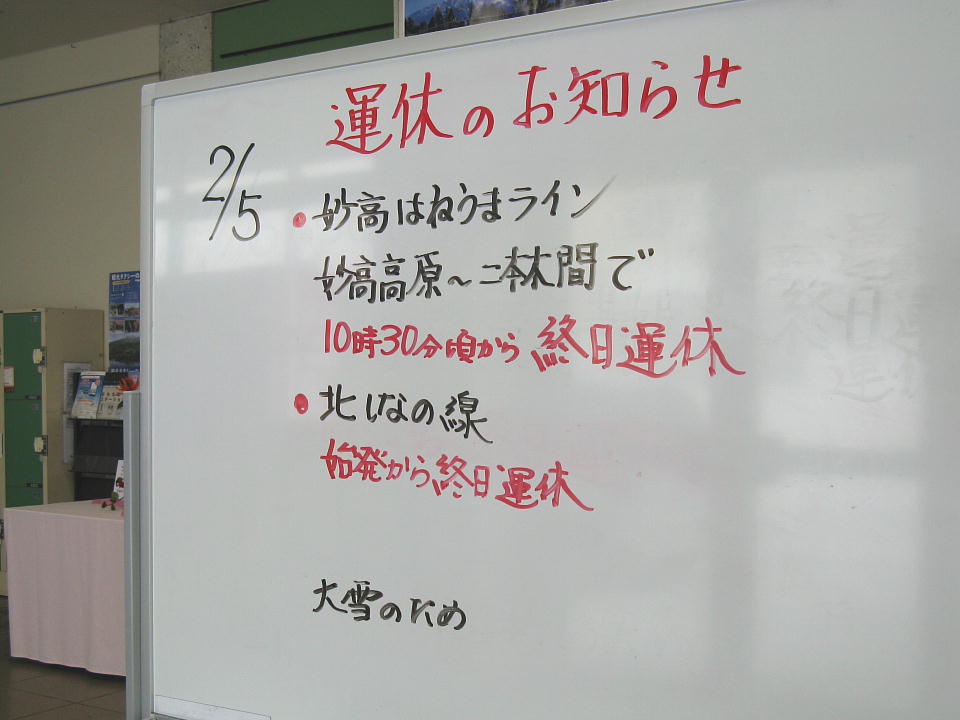 | 妙高高原駅に来てみたら、遅れどころか終日運休になってしまっていた。 上り快速の前の普通列車は走っていたので、 その後に運休になったようだ。 窓口氏によれば、快速は二本木折り返しになったとのこと。 |