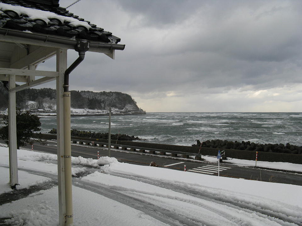| お昼ご飯が終わって、有間川駅に来た。 駅の前には大幹線の国道8号が通り、その向こうには荒れた日本海が広がる。 天気の変化がとにかくめまぐるしい。 この写真は、雪が降っていなかった一瞬に撮影したが、その前後は猛吹雪である。 そして、風は一貫して西から強く吹いている。 でも撮影は、駅舎の中から雪や風の影響を受けることなくできるのだ。 わはは。 |