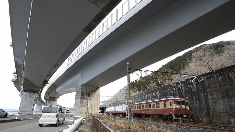 | 午前中はいつもなら妙高周辺で上下の快速を撮影しているのだが、 今回は既に市振・親不知エリアにいるので快速の撮影はパスし、 これまでやりたくてもなかなかできなかったロケハンをした。 そしてお昼過ぎに「急行1号」を狙う。 よし、来たっと録画を開始した直後、あ"~カブったぁ! さて、どうなったでしょうか。 約36秒の動画はこちら。 エレベーターで上げたカメラが強風であおられて揺れているので、再チャレンジだね。 |