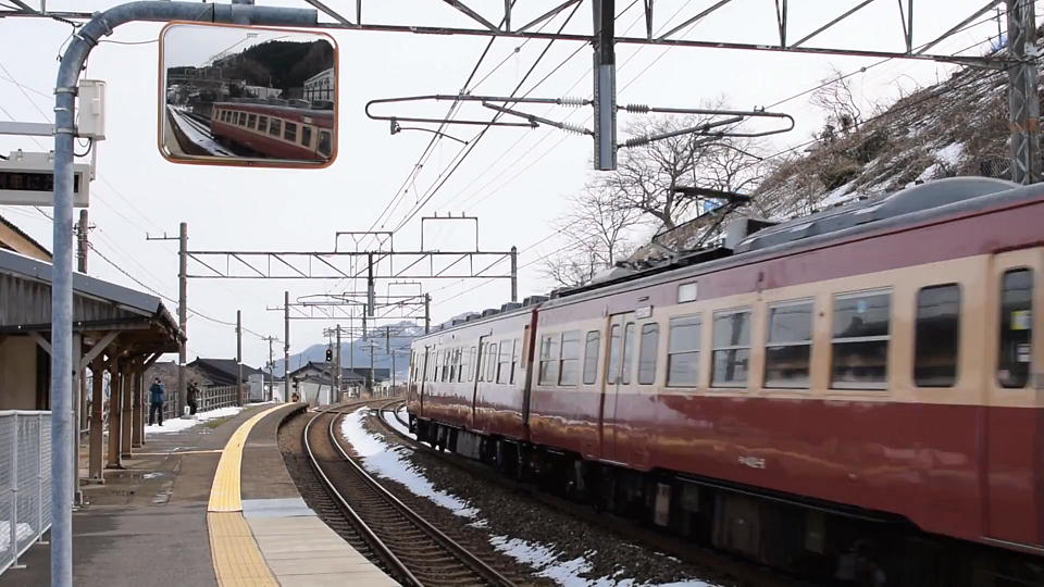 | 快速の撮影が終わり、有間川駅に来た。 ここで「急行1号」を迎える。 有間川駅舎の木造の庇とミラーを入れたつもりだが、 あんましうまく撮れてないんで、再チャレンジします。 約37秒の動画はこちら。 |