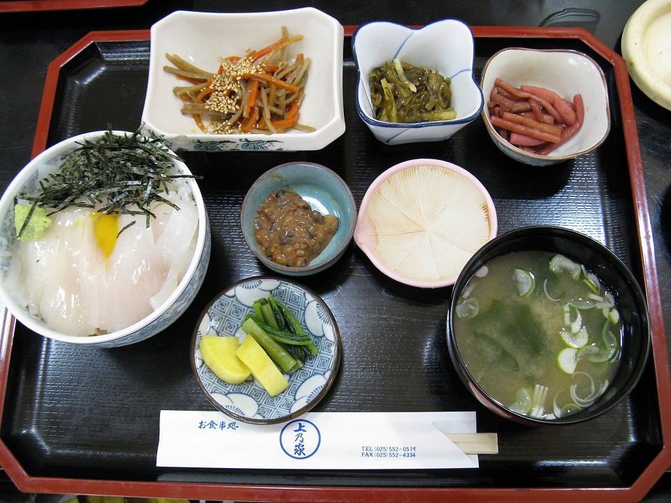 | 昼メシは糸魚川駅前の「上之家」でいか丼1,100円ナリ。 コリコリしたイカが旨いのだが、俺的には量がもう少し欲しい。 大盛だと330円増しというなかなか強気な値段になるのだが、 果たしてイカがしっかり大盛になってくれるんだろうか。 これがもし、ごはんが大盛になるだけだったら悲しい。 次は大盛にしてみたいね。 十分旨かったよ。 |
