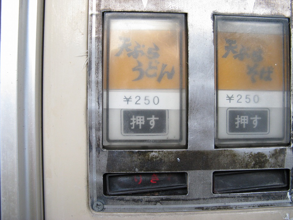 | お、今朝はうどんがうりきれだ。 しかし、この「うりきれ」の表示は、なんでこんなにナナメってるんだろ(笑)? |