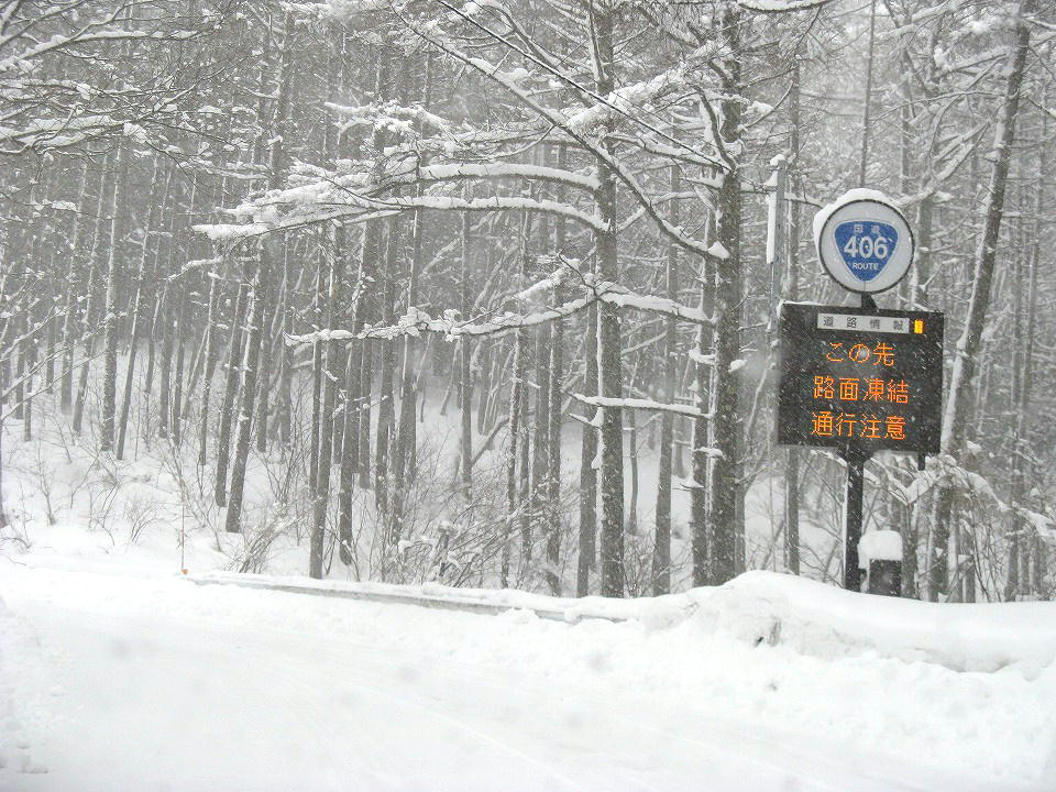 | 糸魚川から信州に帰るのに、いつもは単純に国道8号~国道18号を使うのだが、 今日は魔が差したのか、国道148号~国道406号を使った。 何となくだが、バス転換が取り沙汰されている大糸線の南小谷~糸魚川に沿って走りたい という気持ちもあった。 この写真は、白馬から国道406号に入り、白沢峠に差しかかる手前に出ていた表示板を クルマを停めて撮影したもの。 撮影後、さて発進、とクルマを動かそうとしたら、滑って上れなくなってしまった。 写真では分かりづらいが実際は結構な上り坂で、ここまでも頻繁にタイヤを空転させながら上ってきていた。 クルマは後ろには動く(バックは下り坂になるなので)から、バックしながら方向変換し、 だいぶ下の傾斜が緩やかな場所までいったん戻り、 そこから勢いを付けて上り、無事に峠まで辿り着いた。 ※表示板がナナメに写っていますが、カメラが傾いたのではなくて、実際にナナメに立っています(笑)。 |